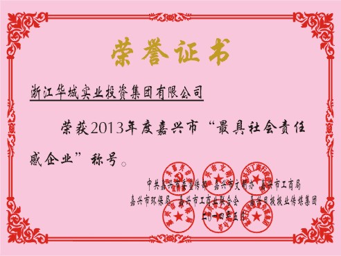 由嘉興市委宣傳部、市文明辦、市工商局、市環(huán)保局、市工商聯(lián)、《嘉興日報》報業(yè)傳媒集團聯(lián)合主辦,《南湖晚報》承辦的嘉興市首屆“最具社會責任感企業(yè)(家)”評選活動,日前評出結(jié)果,華城集團喜獲嘉興市首屆“最具社會責任感企業(yè)”稱號。