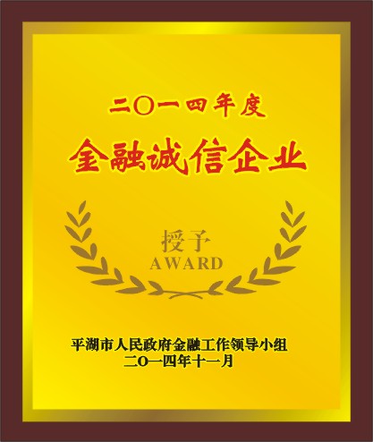 為進(jìn)一步推進(jìn)落實(shí)“信用平湖”建設(shè)工作,構(gòu)建良好銀企環(huán)境,促進(jìn)經(jīng)濟(jì)持續(xù)健康發(fā)展,平湖市人民政府金融工作領(lǐng)導(dǎo)小組組織開展了“金融誠信企業(yè)”評選活動(dòng),我公司被授予“2014年度金融誠信企業(yè)”光榮稱號。