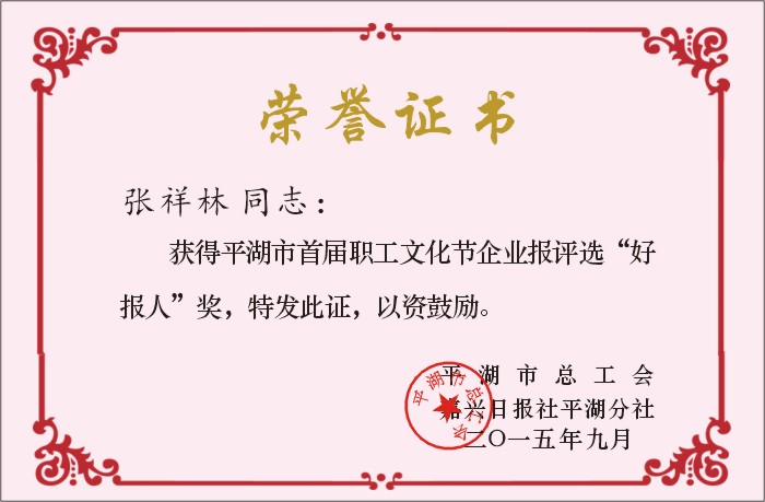 為促進(jìn)企業(yè)報(bào)發(fā)展,推動(dòng)企業(yè)文化建設(shè),日前,平湖市總工會(huì)與嘉興日?qǐng)?bào)社平湖分社聯(lián)合舉辦了平湖市首屆職工文化節(jié)暨企業(yè)報(bào)“三好”評(píng)選活動(dòng),我公司董事長(zhǎng)張祥林榮獲平湖市首屆職工文化節(jié)企業(yè)報(bào)評(píng)選“好報(bào)人”稱(chēng)號(hào)。