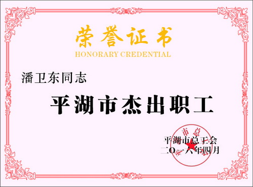 為總結(jié)經(jīng)驗,樹立典型,弘揚先進,努力推動并形成勞動最光榮、勞動最崇高、勞動最偉大、勞動最美麗的社會風(fēng)尚,日前在平湖市總工會主辦的5.1表彰大會暨首屆職工文化節(jié)讀書活動啟動儀式上, 18個集體被授予平湖市“工人先鋒號”榮譽稱號,10名個人獲得平湖市“杰出職工”榮譽稱號。我公司員工潘衛(wèi)東榮獲平湖市“杰出職工”榮譽稱號。