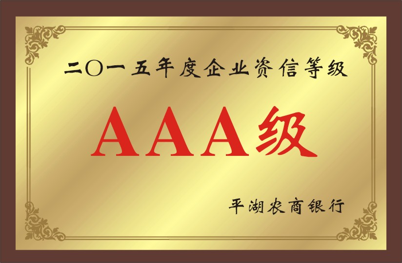 企業(yè)資信等級一等資信狀況包括三個資信級別,即AAA級、AA級和A級!癆AA”表示企業(yè)經營處于良性循環(huán)狀態(tài),資產質量優(yōu)良,經營業(yè)績好,支付能力很強,信譽極好,清償能力非常強,風險最小,是資信等級中的最高級別。我公司近日又獲平湖農商銀行2015年度AAA級企業(yè)資信等級證書。