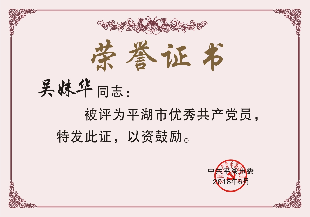“平湖市優(yōu)秀共產(chǎn)黨員”獲得者吳妹華獲獎后感言:感謝各級領(lǐng)導(dǎo)和同事們對我們的信任和工作的肯定,面對“優(yōu)秀共產(chǎn)黨員”的殊榮,我深深地感受到了同事們對我工作的鼓勵、支持與期待,成績不是終點,而是全新的起點。今后,我會把“優(yōu)秀黨員”這個榮譽看作是對自己的鼓勵和鞭策,在工作崗位上一如既往,繼續(xù)努力。