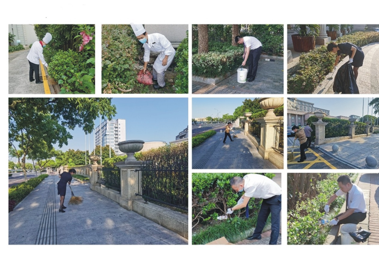 拿上垃圾袋、水桶、掃把等裝備,大家根據(jù)分派到的任務(wù)三人一組,撿煙蒂、綠化帶垃圾清理、停車場主干道及死角清理......通過互相配合。對酒店進(jìn)行了一次全面“清潔”,不放過任何一個(gè)死角。