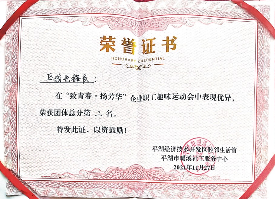 為慶祝中國共產(chǎn)黨成立100周年,充分展現(xiàn)企業(yè)員工良好的精神風(fēng)貌和健康生活理念,共同營造積極向上、充滿活力的工作氛圍,豐富員工文體生活,培養(yǎng)員工敢于挑戰(zhàn)的拼搏精神和精誠合作的團(tuán)隊(duì)精神,切實(shí)增強(qiáng)員工的凝聚力和戰(zhàn)斗力,平湖市經(jīng)濟(jì)技術(shù)開發(fā)區(qū)睦鄰館于11月27日在睦鄰館舉辦“致青春•揚(yáng)芳華”經(jīng)開企業(yè)職工趣味運(yùn)動(dòng)會(huì)。我公司由10位員工組成的兩個(gè)參賽隊(duì)“華城先鋒隊(duì)”和“華城突擊隊(duì)”參加了此次趣味運(yùn)動(dòng)會(huì)。