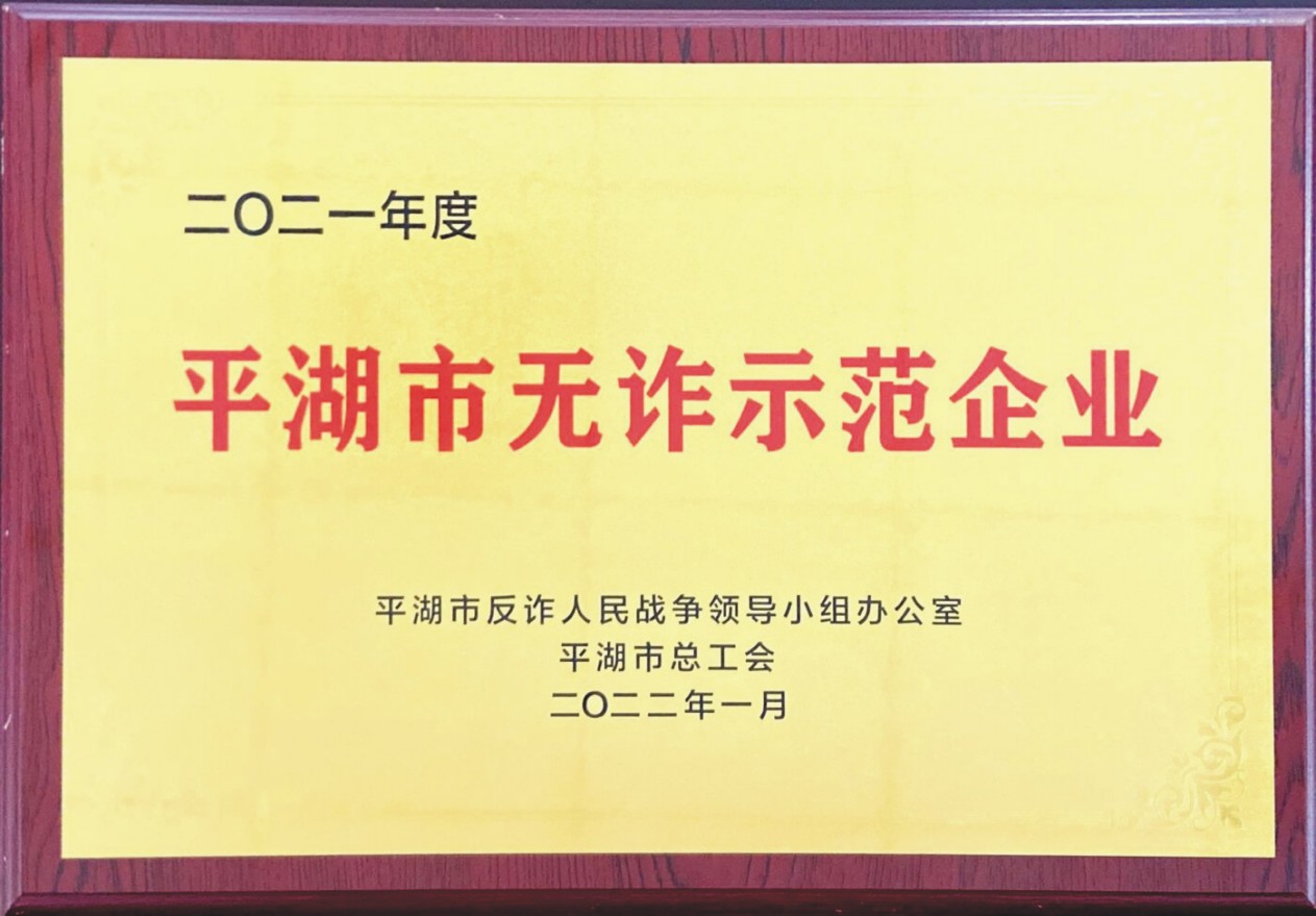 2022年1月,平湖市反詐人民戰(zhàn)爭領導小組辦公室、市總工會授予平湖華城衣歌路服飾有限公司2021年度“平湖市無詐示范企業(yè)”榮譽稱號。