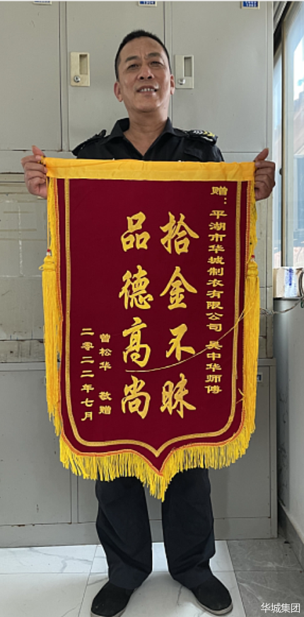 當(dāng)?shù)玫较⒌脑扇A急匆匆趕來(lái),捧著失而復(fù)得的包時(shí),心里的激動(dòng)無(wú)法表達(dá)。一定要向吳中華當(dāng)面酬謝,吳中華堅(jiān)決拒絕。包包找到失主,他同樣開(kāi)心不已。為了表達(dá)衷心的謝意,隔日,曾松華又來(lái)到華城制衣,向吳中華送上“拾金不昧,品德高尚”錦旗。