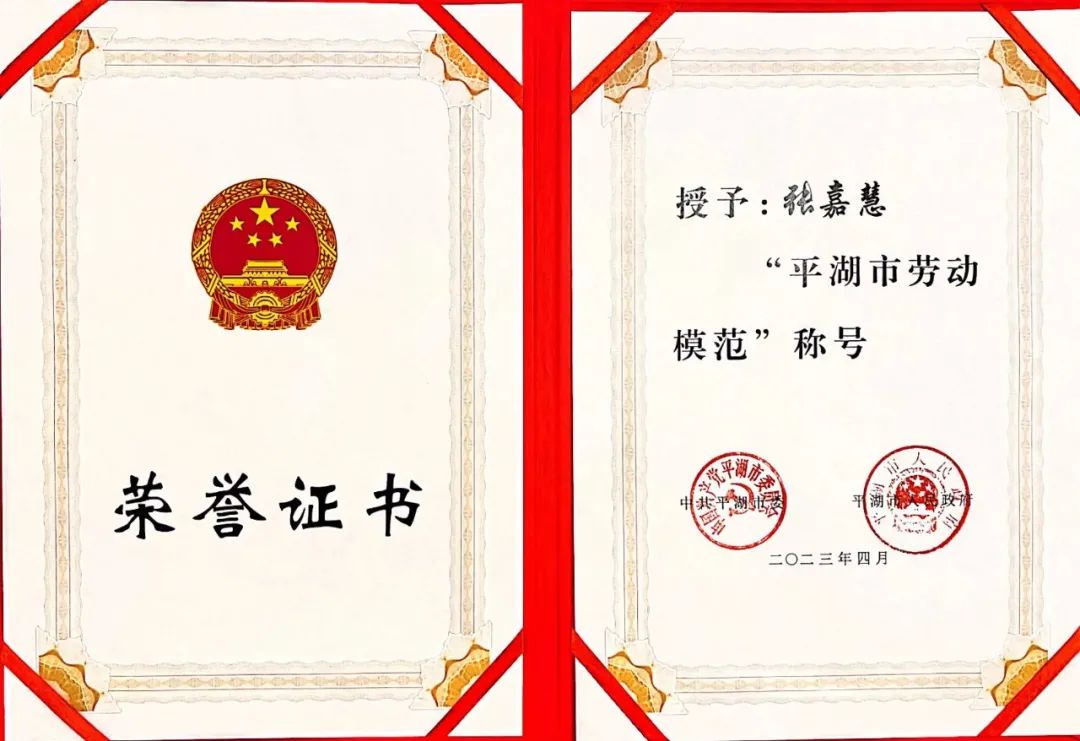 當(dāng)前位置:首頁(yè) > 華城動(dòng)態(tài)向勞模致敬,為先進(jìn)點(diǎn)贊。4月28日上午,平湖市慶祝“五一”國(guó)際勞動(dòng)節(jié)暨勞動(dòng)模范和先進(jìn)集體頒獎(jiǎng)儀式隆重舉行。會(huì)上,表彰了2018-2022年全市各行各業(yè)涌現(xiàn)出的勞動(dòng)模范和先進(jìn)集體。我公司董事長(zhǎng)助理張嘉慧被授予“平湖市勞動(dòng)模范”榮譽(yù)稱(chēng)號(hào)。