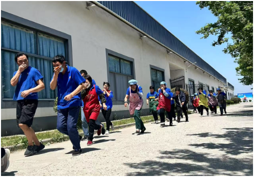 警鈴響起,所有員工反應(yīng)迅速,手捂口鼻,彎腰沿著安全標(biāo)識(shí),朝安全出口逃生,到緊急疏散集合點(diǎn)集合。